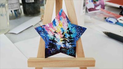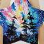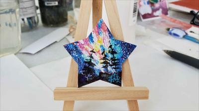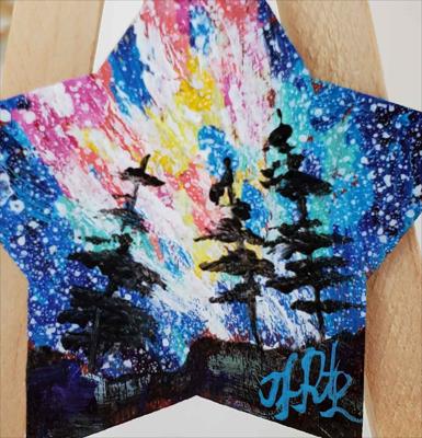 Un aimant orné d'une image de ciel étoilé et de sapins sur un versant de montagne, une mini-étoile.