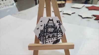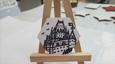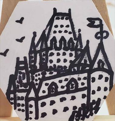 Un aimant de réfrigérateur noir et blanc représentant une miniature hexagonale du Château Frontenac.