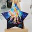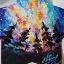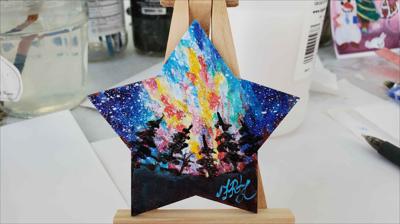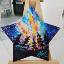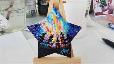 Un aimant de réfrigérateur en forme d'étoile, représentant un ciel étoilé et la Voie lactée en arrière-plan, est peint à la peinture acrylique sur un support en bois et verni.