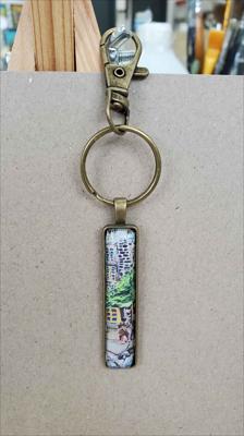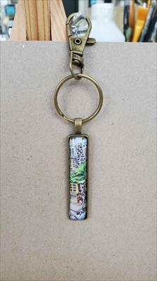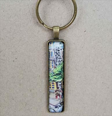 Porte-clés rectangulaire en bronze, reproduisant un tableau de la galerie ARTKELA représentant un chien.