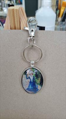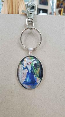 Un grand porte-clés ovale en argent reproduisant un tableau de la galerie ARTKELA, représentant une dame en robe bleue.
