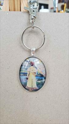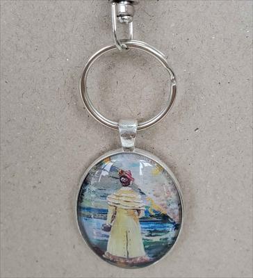 Un porte-clés reproduisant le tableau de la galerie ARTKELA, ovale, dans une robe jaune.