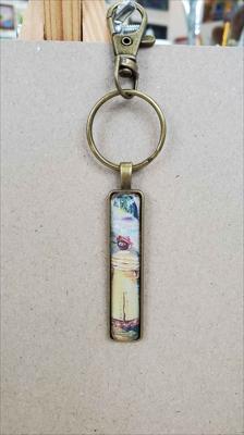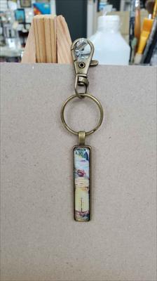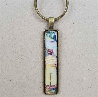 Un porte-clés rectangulaire en bronze reproduisant une peinture de la galerie ARTKELA, représentant une femme en robe jaune.