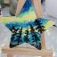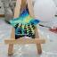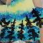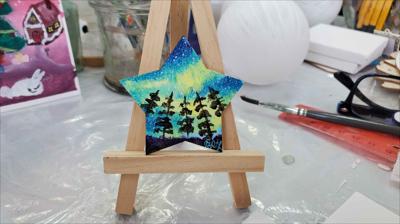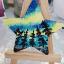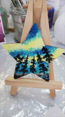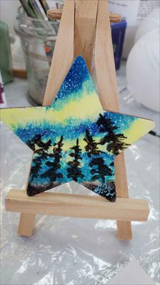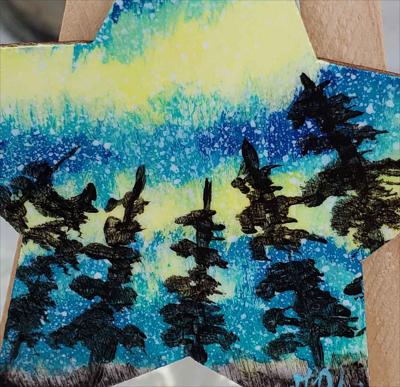 Aurores boréales magnétiques au-dessus de la forêt, 3 étoiles peintes à la peinture acrylique sur une base en bois vernie.