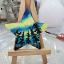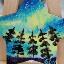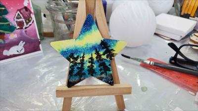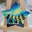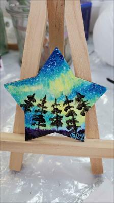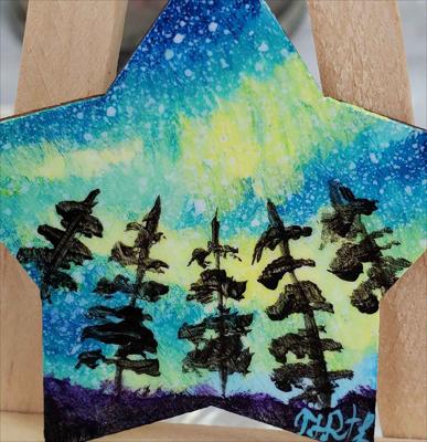 Aurores boréales magnétiques au-dessus de la forêt. 4 petites étoiles peintes à la peinture acrylique sur une base en bois vernie.
