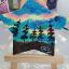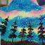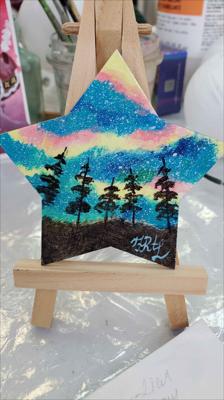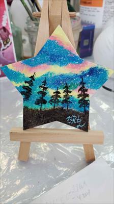 Aurores boréales magnétiques au-dessus de la province forestière du Nunavut. Une étoile peinte à la peinture acrylique sur une base en bois vernie.