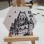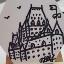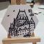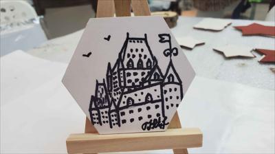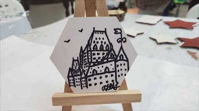 Aimant de réfrigérateur noir et blanc avec une image du Château Frontenac 4 hexagone 01012025 peint à la peinture acrylique, au marqueur et verni.