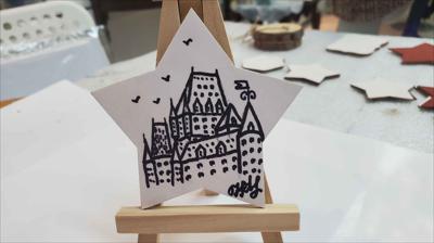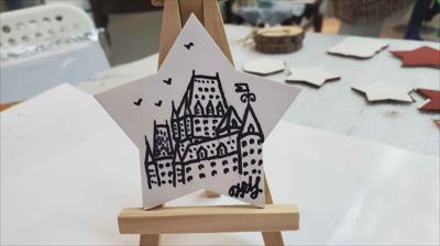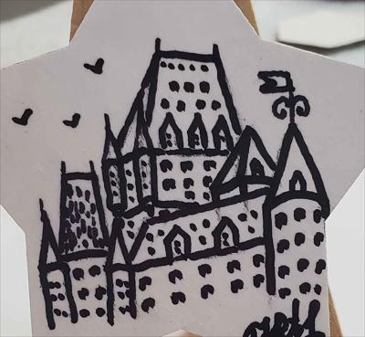 Aimant de réfrigérateur noir et blanc représentant le Château Frontenac 5 étoiles 01012025, peint à la peinture acrylique, au marqueur et verni.