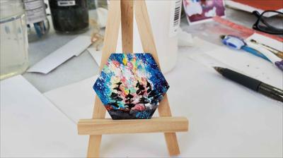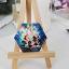 Aimant hexagonal avec un ciel étoilé au-dessus d'une forêt dans le silence silencieux du Québec 317012026 peint à la peinture acrylique sur une base en bois et verni.
