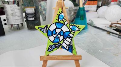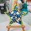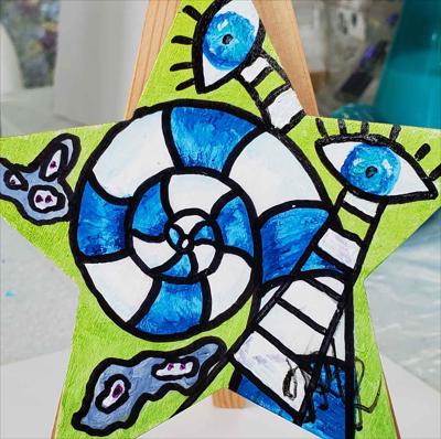 Un grand aimant de réfrigérateur en forme d'étoile, abstrait, vert clair et bleu, avec des yeux.
