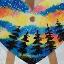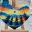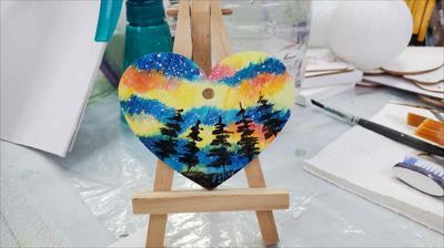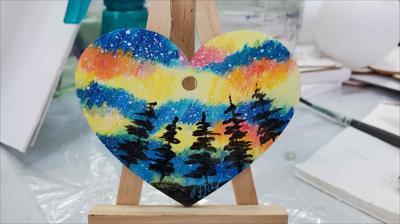 Cœur en bois suspendu à une ficelle, orné d'aurores boréales du Nunavut, peint à l'acrylique sur bois et verni.