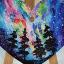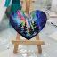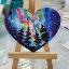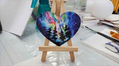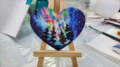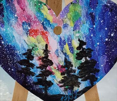 Un cœur en bois suspendu à une ficelle, orné d'un ciel étoilé du Québec et de sapins de la région de Charlevoix, peint à l'acrylique sur un support en bois et verni.