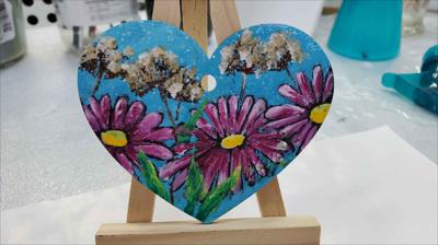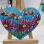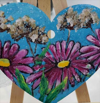 Cœur en bois suspendu à une ficelle, orné de chrysanthèmes violets en septembre, peint à la peinture acrylique sur un support en bois et verni.