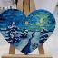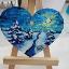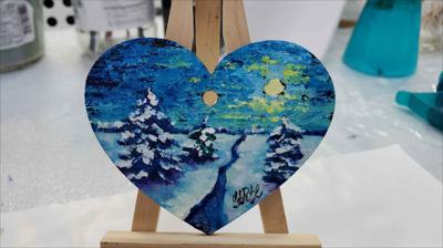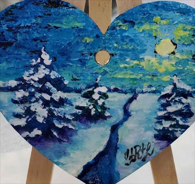 Un cœur en bois suspendu à une ficelle, avec une nuit glaciale au clair de lune et une forêt au-delà du champ ; le tableau est réalisé à la peinture acrylique sur un support en bois et verni.