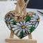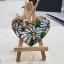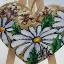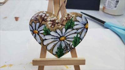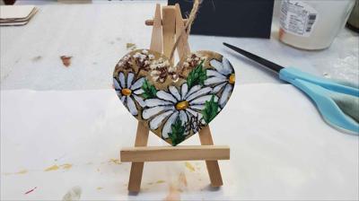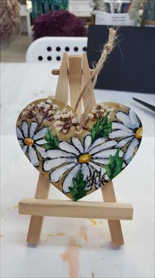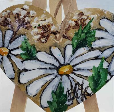 Cœur en bois suspendu à une ficelle, orné de chrysanthèmes blancs en septembre, peint à la peinture acrylique sur un support en bois et verni.