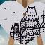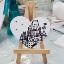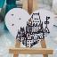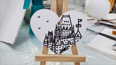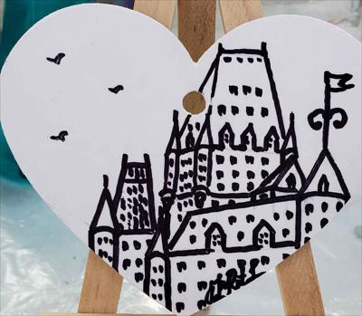 Cœur en bois suspendu à une ficelle, orné d'un frontenac blanc et noir et de trois oiseaux.