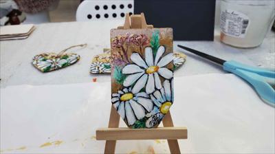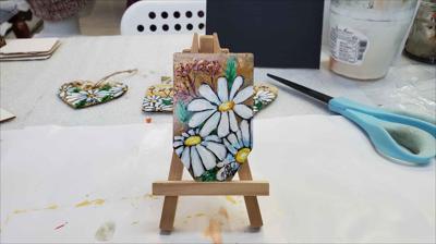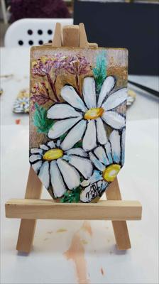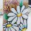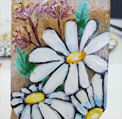 Cet aimant hexagonal pour réfrigérateur représente des marguerites blanches par une journée d'été et du duvet de juin, peints à l'acrylique sur une base en bois et vernis.