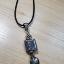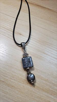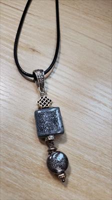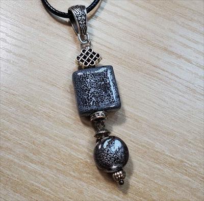 Pendentif en céramique grise avec un carré et un cercle à motif alvéolé à la base, entièrement assemblé à la main.