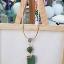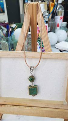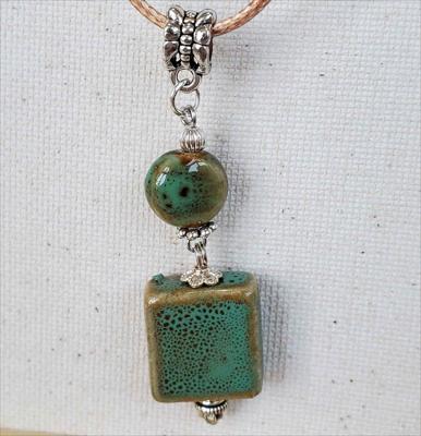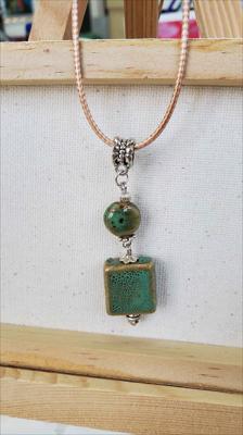 Pendentif en céramique orné de turquoise verte et d'un œil à deux pupilles, entièrement assemblé à la main.