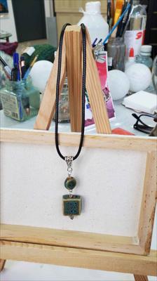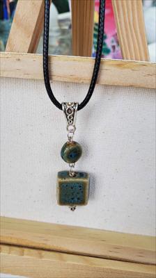 Pendentif en céramique orné de turquoise bleue et d'un cône, entièrement assemblé à la main.