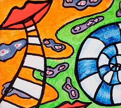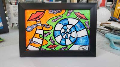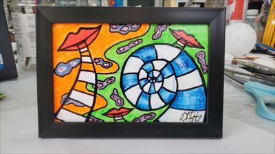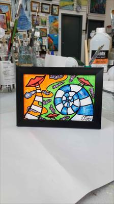Paroles, paroles, conversations, conversations, peinture abstraite : le tableau est peint à la peinture acrylique sur carton et encadré.