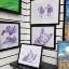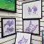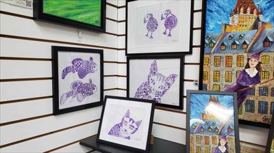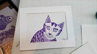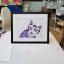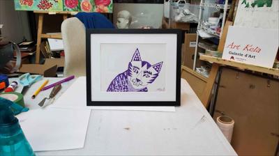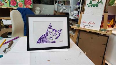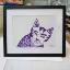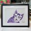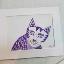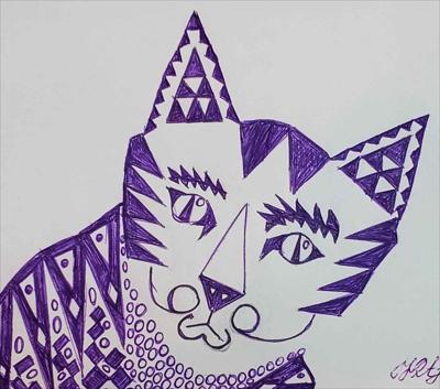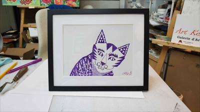 Graphisme : Un chat sérieux composé de formes géométriques simples, le tableau a été réalisé au stylo gel sur papier et encadré d’un passe-partout.