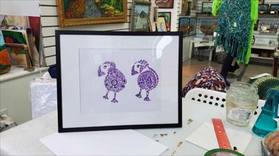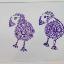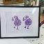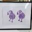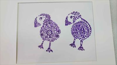 Deux. Oiseaux du genre Fratercula arctica. Un couple se déplaçant dans l'espace. Le dessin a été réalisé au stylo gel sur papier, puis encadré et présenté sous passe-partout.