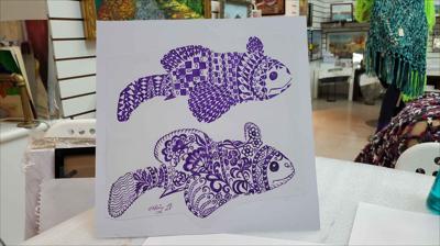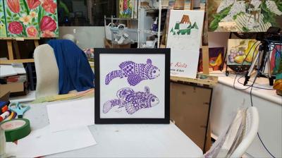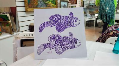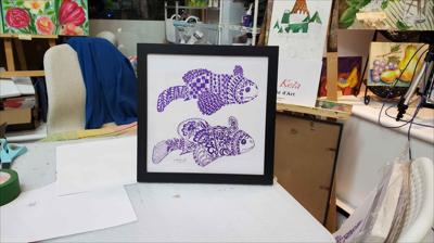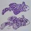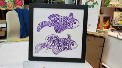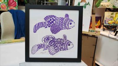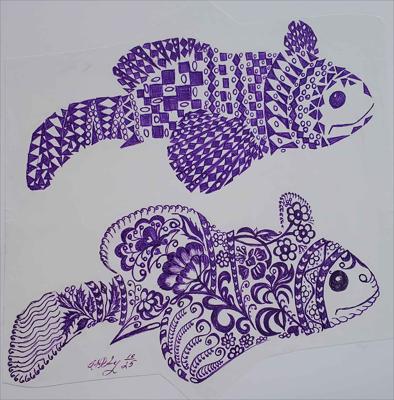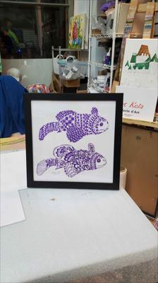 Deux poissons. Un couple qui se déplace dans l'espace. Illustration. Le dessin a été réalisé au stylo gel sur papier et encadré.