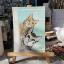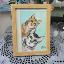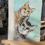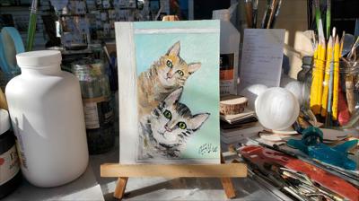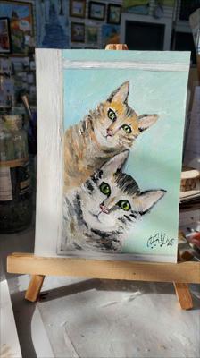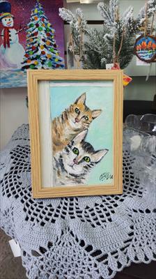 Deux chats curieux regardent par la fenêtre ; le tableau est peint à l'huile sur carton et encadré.