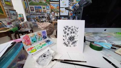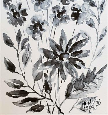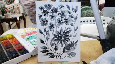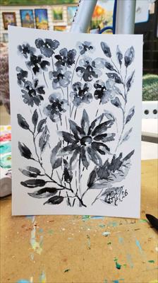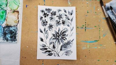 Prairie fleurie dans un vieux téléviseur, le tableau est réalisé à l'aquarelle sur papier aquarelle et encadré sous passe-partout.
