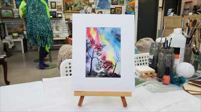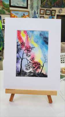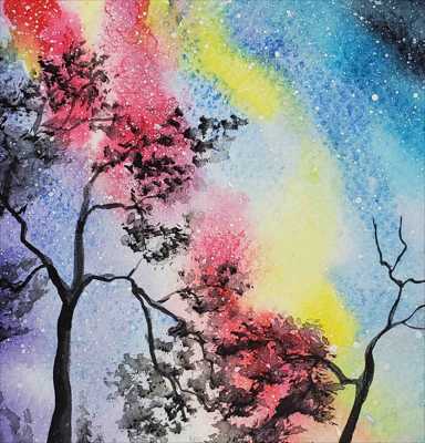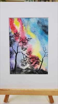 La pluie de météores des Aurigides a été observée début septembre 2025. Cette peinture est une aquarelle sur papier et est encadrée dans un passe-partout.