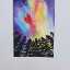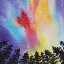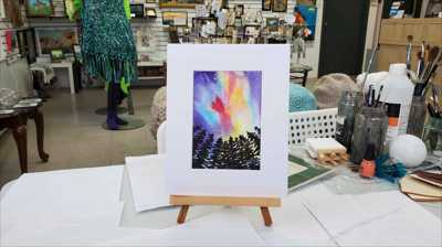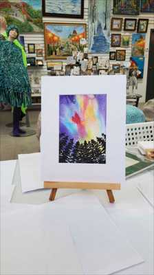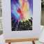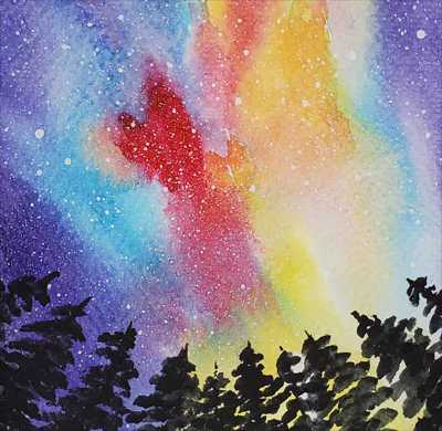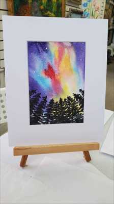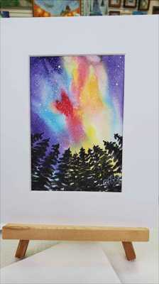 La pluie de météores des Aurigides laisse une traînée jaunâtre dans le ciel, cette aquarelle est peinte sur papier et encadrée dans un passe-partout.
