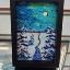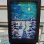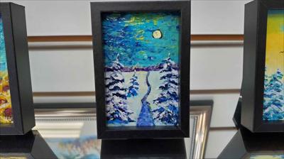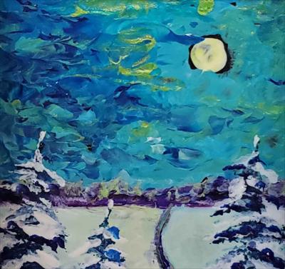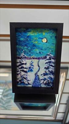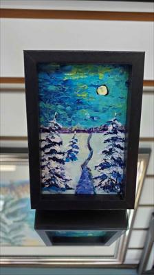 Tout, en miniature, scintille et brille sous la pleine lune sur un tapis enneigé ; le tableau est peint à la peinture acrylique sur carton et encadré.