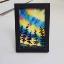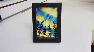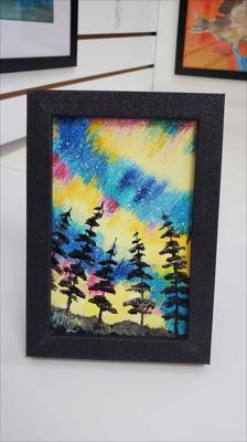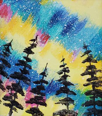 Les aurores boréales au Québec illuminent le ciel et le colorent pour les fêtes. Ce tableau est réalisé à la peinture acrylique sur carton, verni et encadré de paillettes.