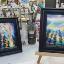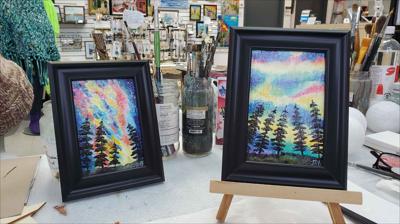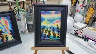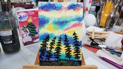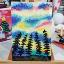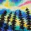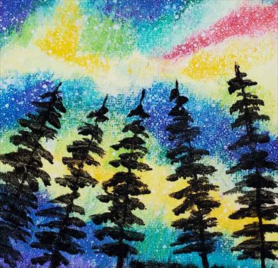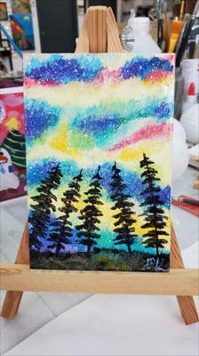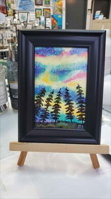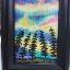 Le ciel scintille de couleurs hivernales sous les aurores boréales, tantôt émeraude, tantôt rose. La toile, montée sur châssis, est peinte à l'acrylique, vernie et encadrée.