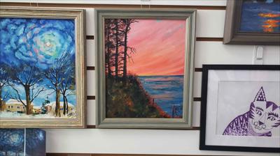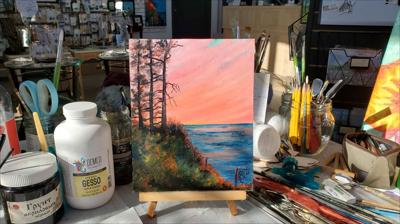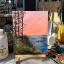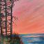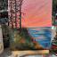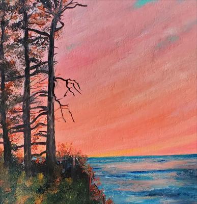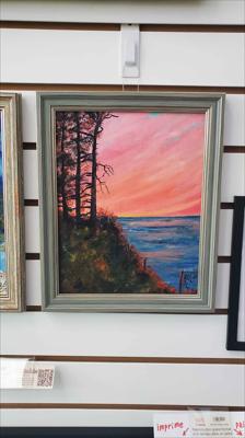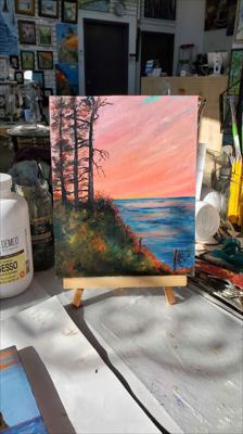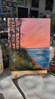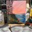 Vue de la magnifique baie du Griffon et de son terrain de camping, en Gaspésie, au Québec. Cette peinture à l'huile sur carton a été réalisée en plein air lors d'un voyage estival en Gaspésie. Elle est encadrée.