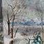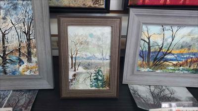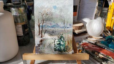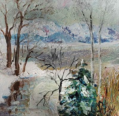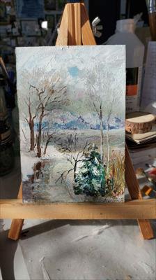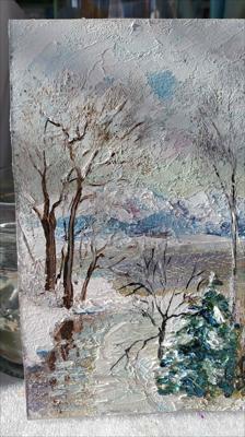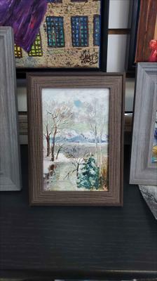 Hiver dans les Appalaches près de Québec, peinture à l'huile sur carton et encadrée.