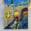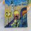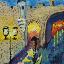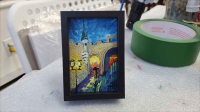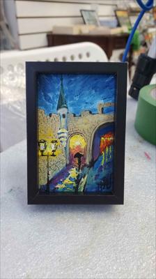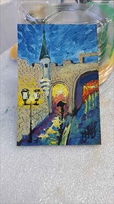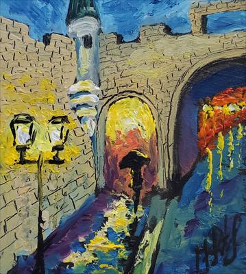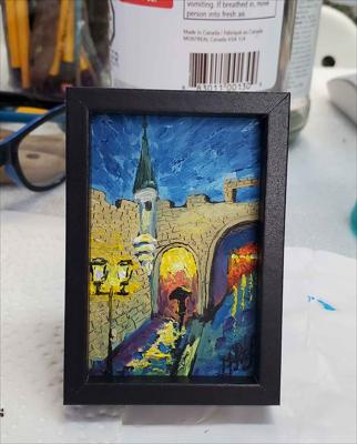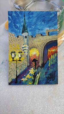 La porte de la rue Saint-Jean éclairée par des lanternes nocturnes dans une atmosphère romantique ; le tableau est peint à l'huile sur carton et encadré.