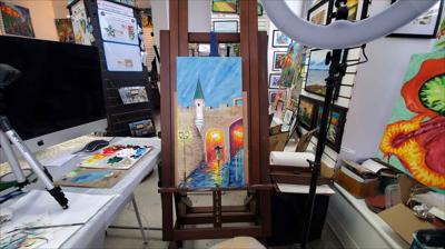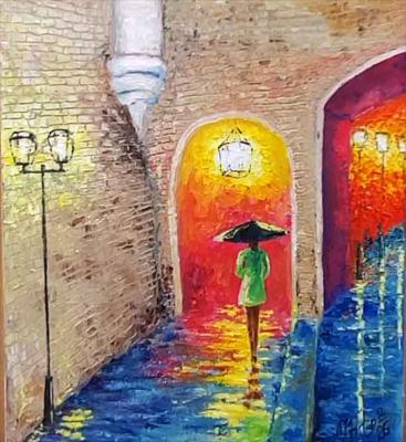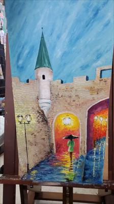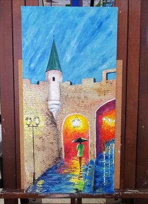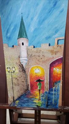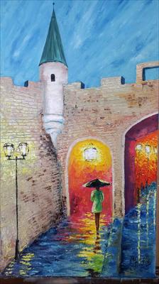 Une soirée magique enveloppait la ville, l'entrée de la porte de la ville sur la rue Saint-Jean, le tableau a été peint à l'huile et au couteau à palette sur toile, la toile est sur un châssis épais.