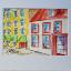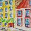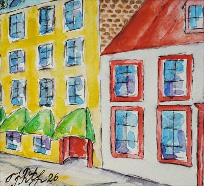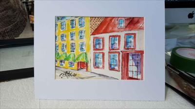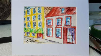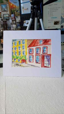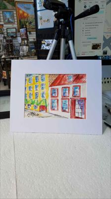La rue Saint-Louis et ses restaurants célèbres, peints à l'aquarelle sur papier aquarelle et encadrés d'un passe-partout.