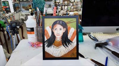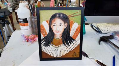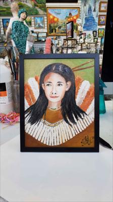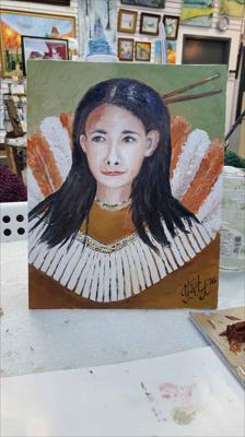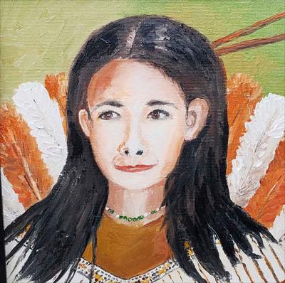 Portrait d'une femme de la réserve indienne de Wendake, à Québec, peint à l'huile sur toile, toile montée sur carton et encadrée.