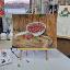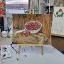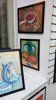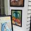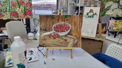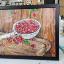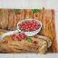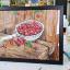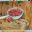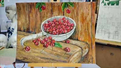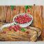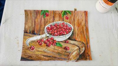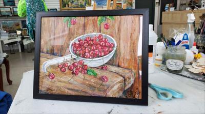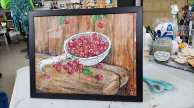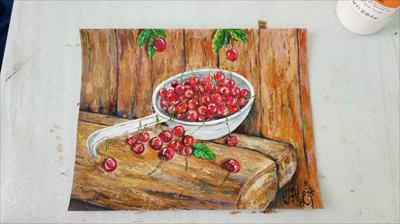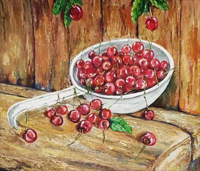 Des cerises mûres dans une louche en aluminium ; le tableau est réalisé à la peinture acrylique sur papier et encadré.