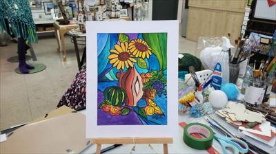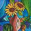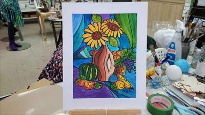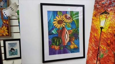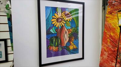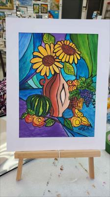Nature morte décorative représentant une fête d'automne, la puissance de la récolte, peinte à la gouache sur papier et encadrée dans un passe-partout.