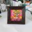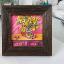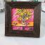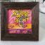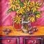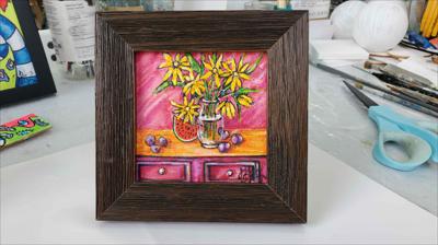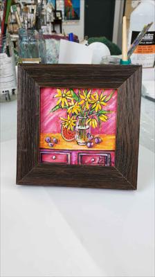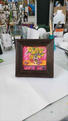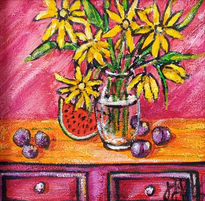 Des chrysanthèmes jaunes, des prunes et une pastèque sur une commode ; le tableau est réalisé à la peinture acrylique sur carton et encadré.